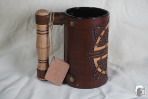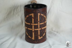 A 20oz mug with a multicolored Dara knot on a medium brown background